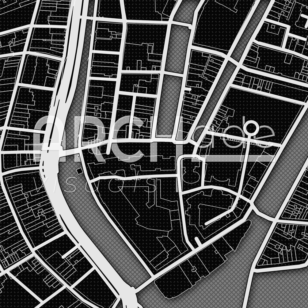 HiRes PSD file of Amsterdam's city center map, represented in black and white geometric style.